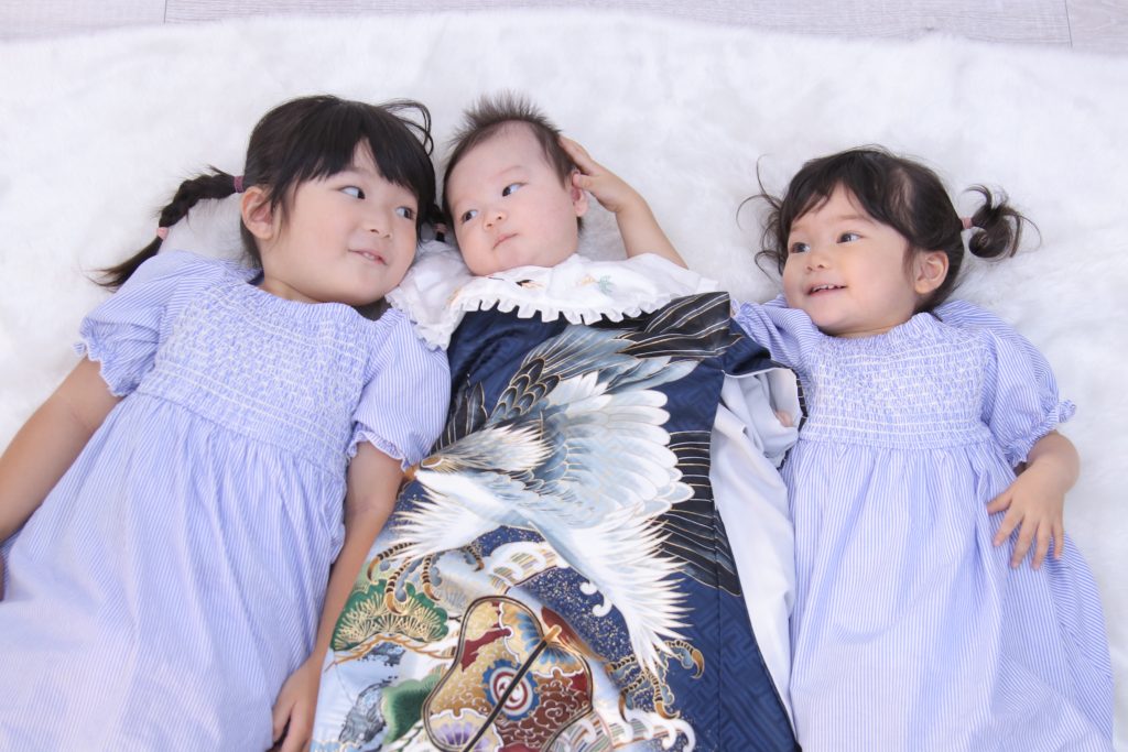 お宮参り撮影では、赤ちゃんだけでなく家族写真も人気です。特に兄弟姉妹がいるご家庭では「全員揃った写真を残したい」と希望される方が多いです。